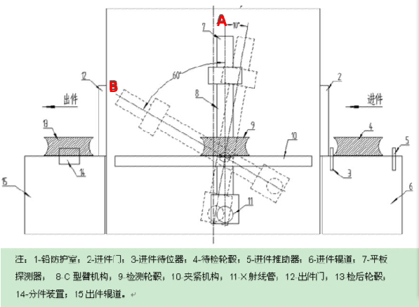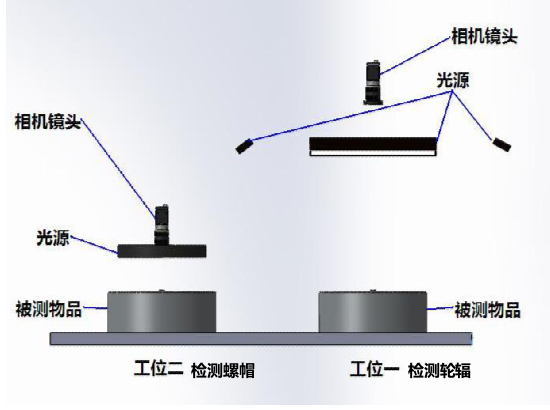 本系統使用于直線方式傳輸,先在“工位一”對被測物品的輪輻進行識別,之后被測物 品移動到“工位二”對螺帽進行識別,視覺系統會綜合兩個工位識別結果判定被測物品的類 別,并輸出相應分類信號,以便后位機對產品進行分類。在“工位一”處:為了不與平板探測器、機械臂相互干涉,相機鏡頭、光源應安裝于平板探測器上方 A 位置,當平板探測儀移 動到 B 位置(即離開相機拍照視場范圍時),機構 PLC 給相機觸發拍照信號,相機對被測物品 進行拍照,視覺系統對其輪輻特征進行識別;在“工位二”處:通過“工位一”識別后,被 測物品由傳輸帶移動到“工位二”時,機構 PLC 給相機觸發拍照信號,視覺系統對其螺帽特征識別。