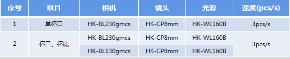 功能:紙杯口部、紙杯底部缺陷檢測、污漬檢測,檢測結果IO信號輸出。